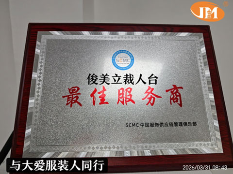 俊美立裁人台也通过卓越表现获得「最佳服务商」称号!感谢SCMC中国服饰供应链管理俱乐部的肯定,更感恩每一位并肩作战的服装人,这不仅是俊美人台的荣耀,更是对我们的鞭策激励。我们始终不忘初心:做一行、 精一行 、 爱一行,用优质产品热诚服务为热爱的服装行业赋能。